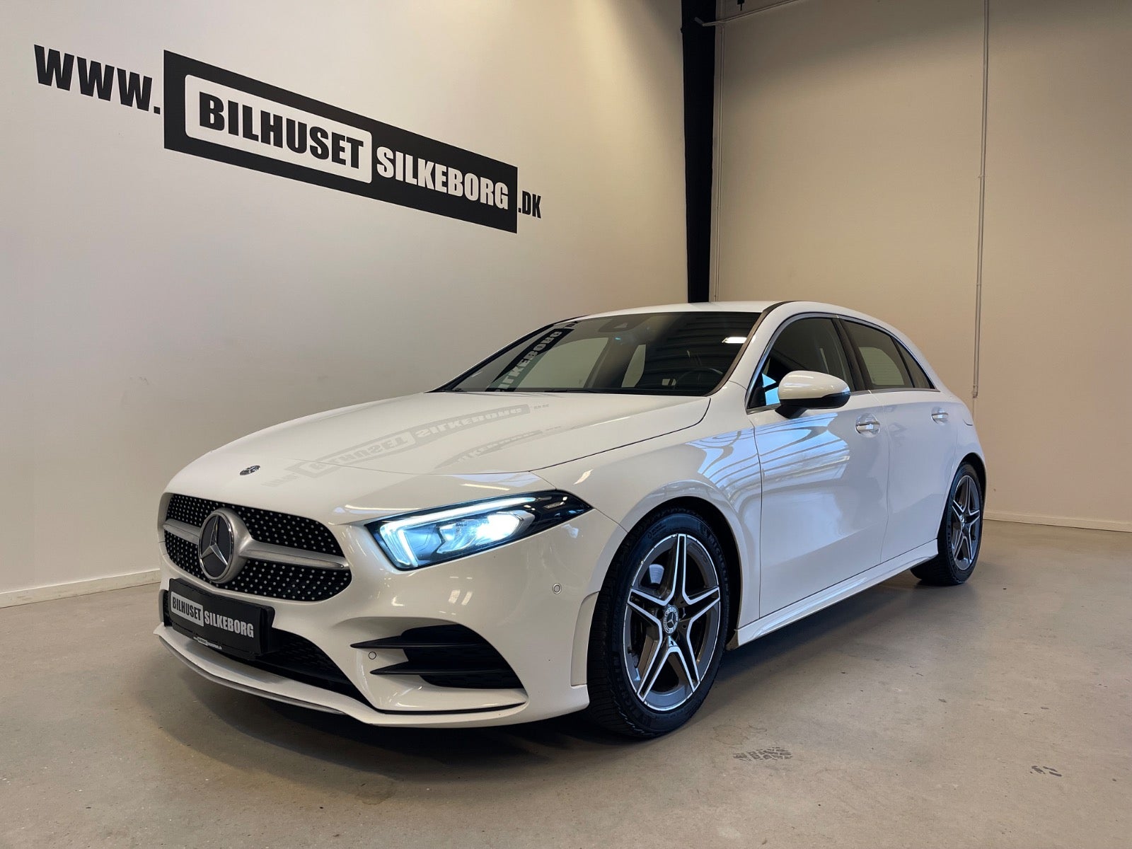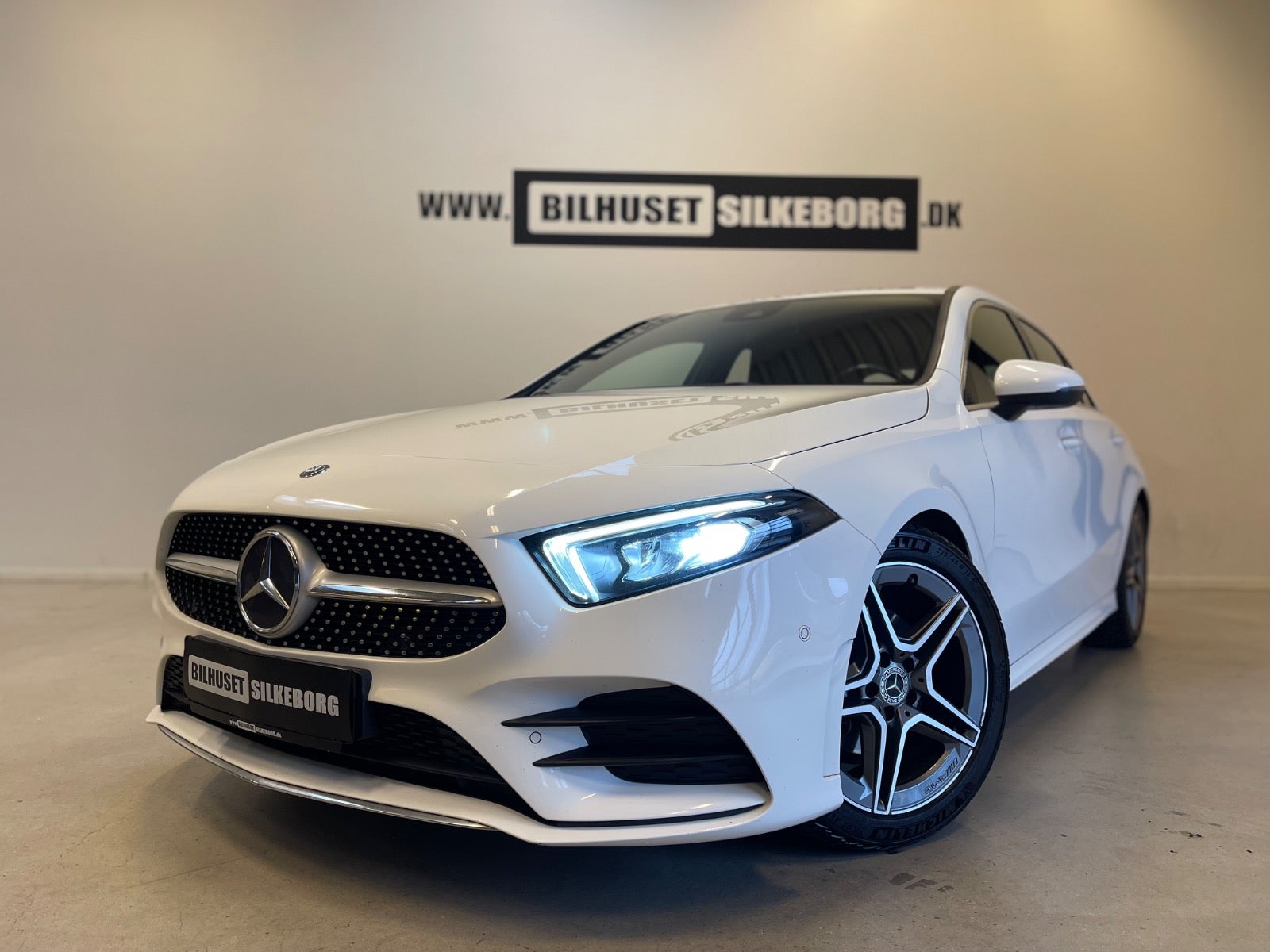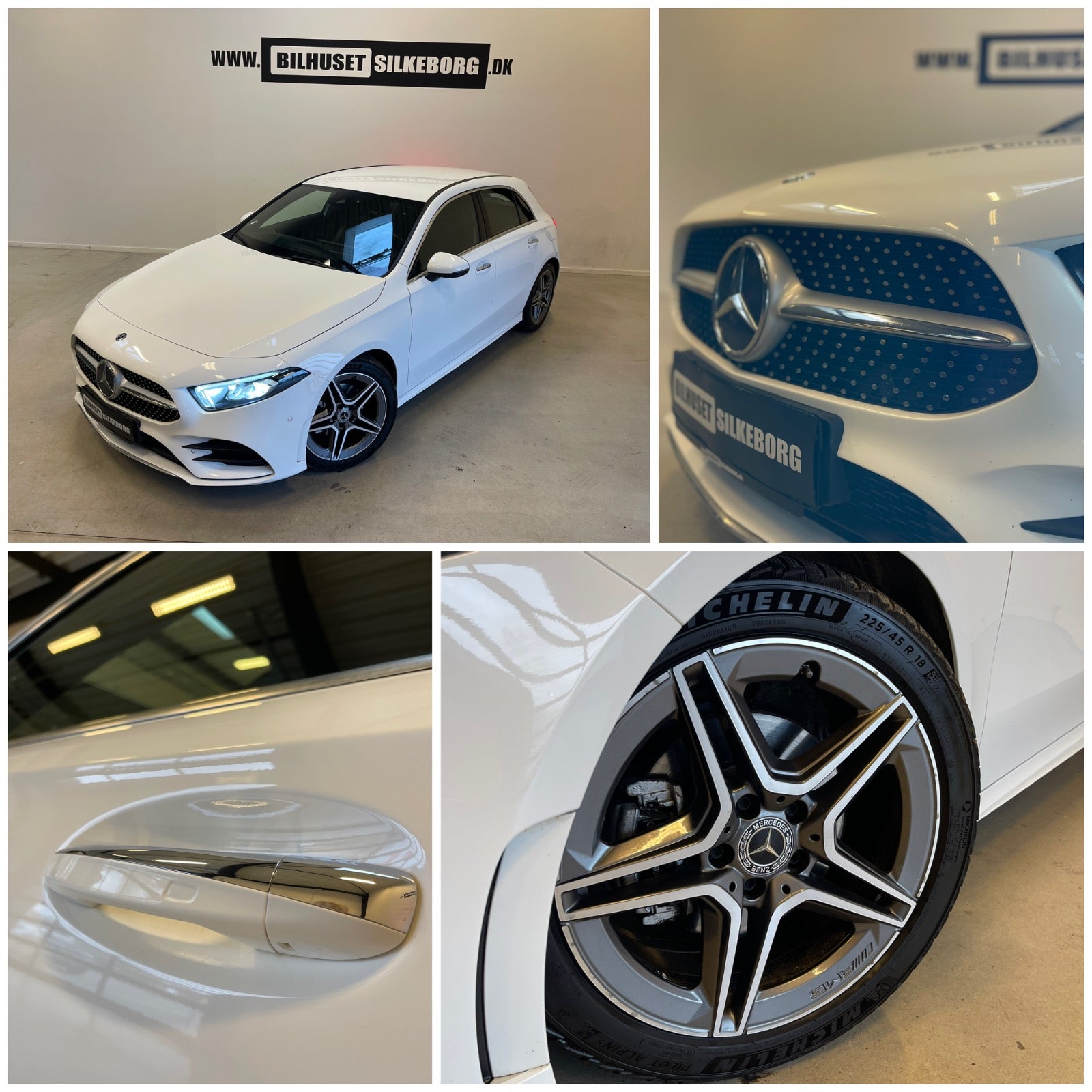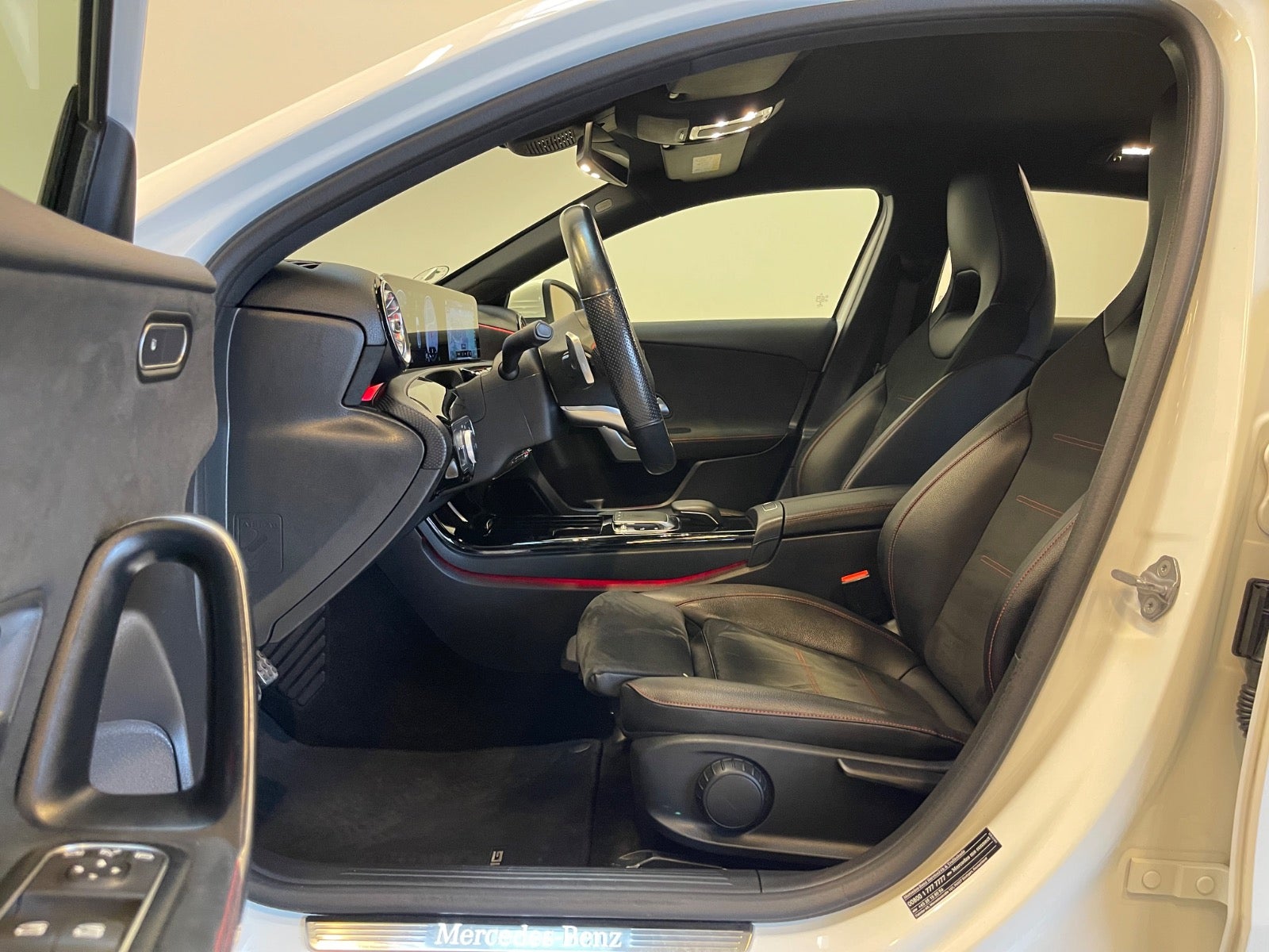 Læder/alcantara kabine m. røde kontrastsyninger, sort lofthimmel, 18" AMG alufælge, fladbundet sportslæderrat m. multifunktion, navigation m. touchscreen, AMG oplyst alu indstigningslister, Premiumpakke, bluetooth telefon & musik streaming, ambiente bleysning m. farvevalg, parkeringssensor for/bag m. optisk visning, aut.gear/tiptronic m. paddleshift, 2 zone klima, regnsensor, touchpad, sædevarme, alcantarabeklædte dørsider, el-klapbare sidespejle m. varme, dæktryksmåler, elektrisk parkeringsbremse m. autohold, træthedsregistrering, AMG måttesæt, isofix, Polarhvid.