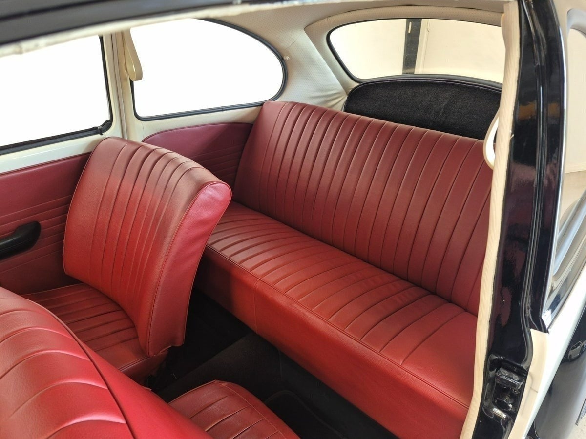 Kabinen er lige så gennemført som resten af bilen med ny polstring i rød nappa læder på både sæder og dørbeklædning. Nye sorte gulvtæpper fuldender det klassiske look.